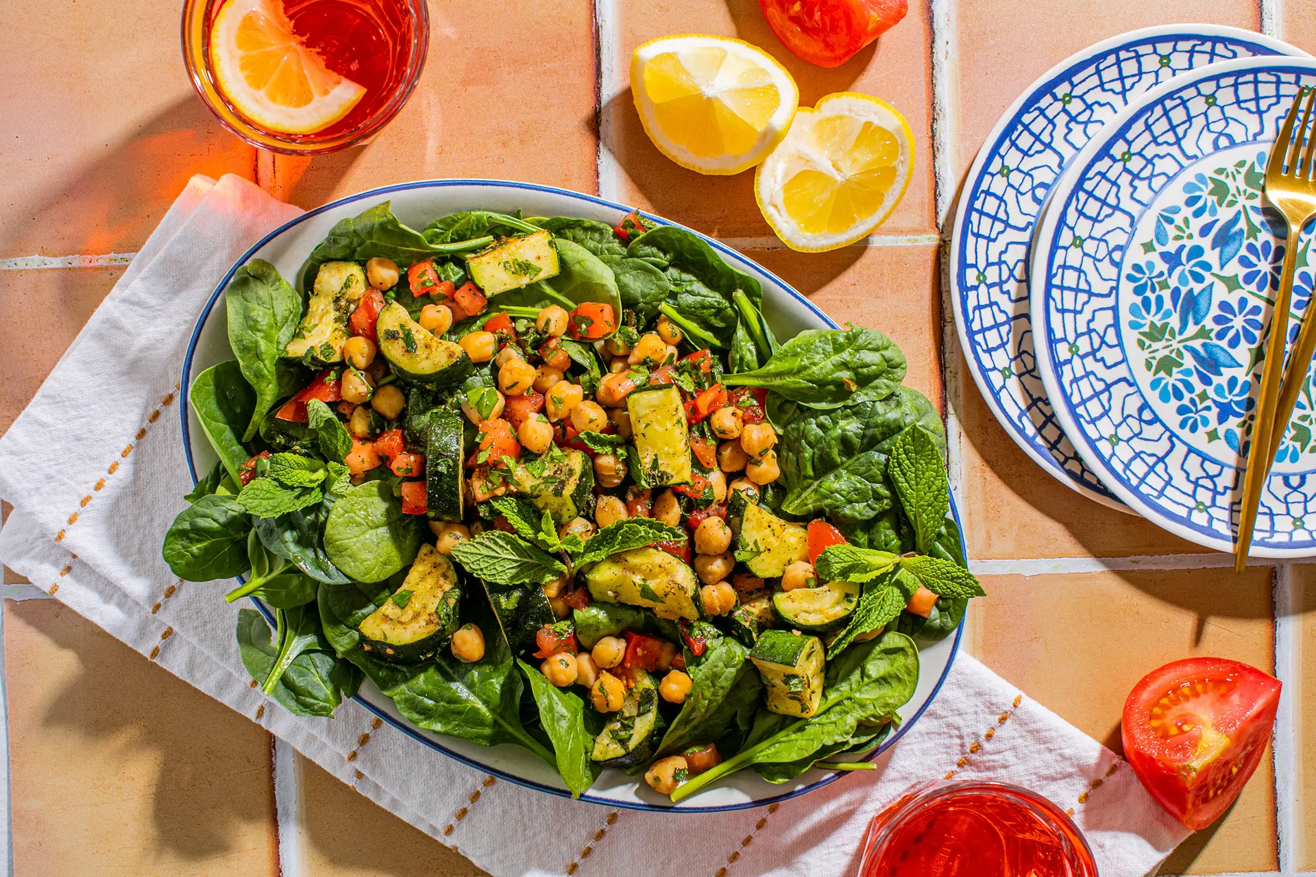 - A chopped salad topped with grilled chicken, chickpeas, and a sprinkle of whole-grain croutons